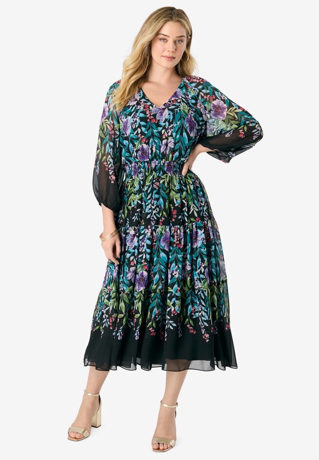 Item Number: 1107675Embrace effortless style with this V-neck tiered dress, designed to flatter with shirring at the waist and flowing blouson sleeves. The tiered skirt adds movement and dimension, making it perfect for both casual days and dressed-up occasions. A versatile piece for your wardrobe!