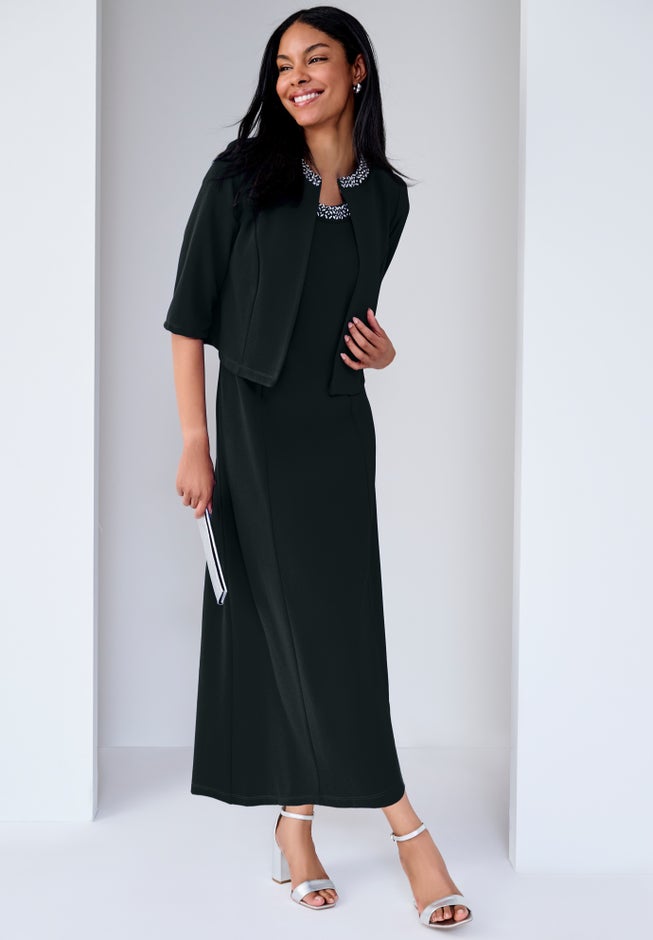 Featuring an eye-catching design and a figure flattering fit, there is not a thing about the Jessica London women's plus size 2-Piece Beaded Jacket Dress that isn't stylish. Beautifully beaded style that goes from corner office to corner table. Sleeveless A-line dress has back zipper; jacket has hook-and-eye closure.