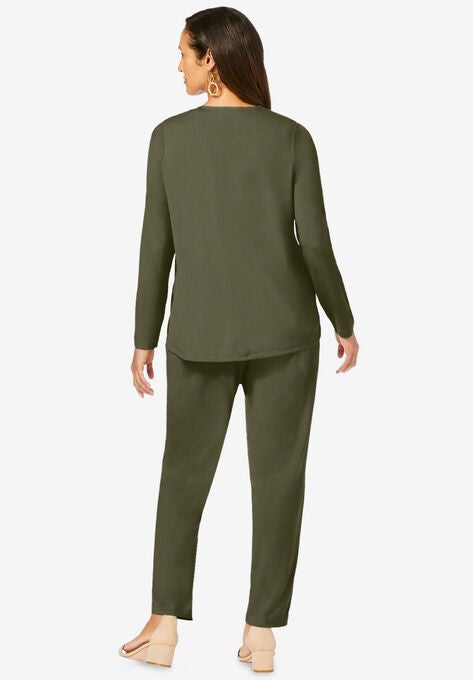 Meet the Jessica London women's plus size 4-Piece Stretch Knit Wardrober from The London Collection — it's your own curated capsule collection! Includes a tank, straight-leg pants, collarless jacket and scoop-neck dress for endless styling options. The stretch jersey knit drapes beautifully, keeps its smooth shape wash after wash, and packs without wrinkling.