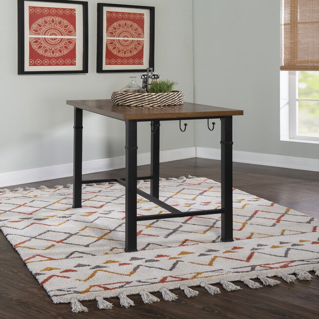 Rustic and industrial in style and design, the Austin Three Piece Pub Set is perfect for small dining rooms and kitchen breakfast nooks. Crafted from metal, the base of the table features a black finish and decorative metal trim accents. Two brown PU upholstered stools, easily tuck beneath the table when not in use. The wood planked top has a rich brown finish. Three hooks are perfect for hanging linens and towels. Stool weight limit is 275 lbs.