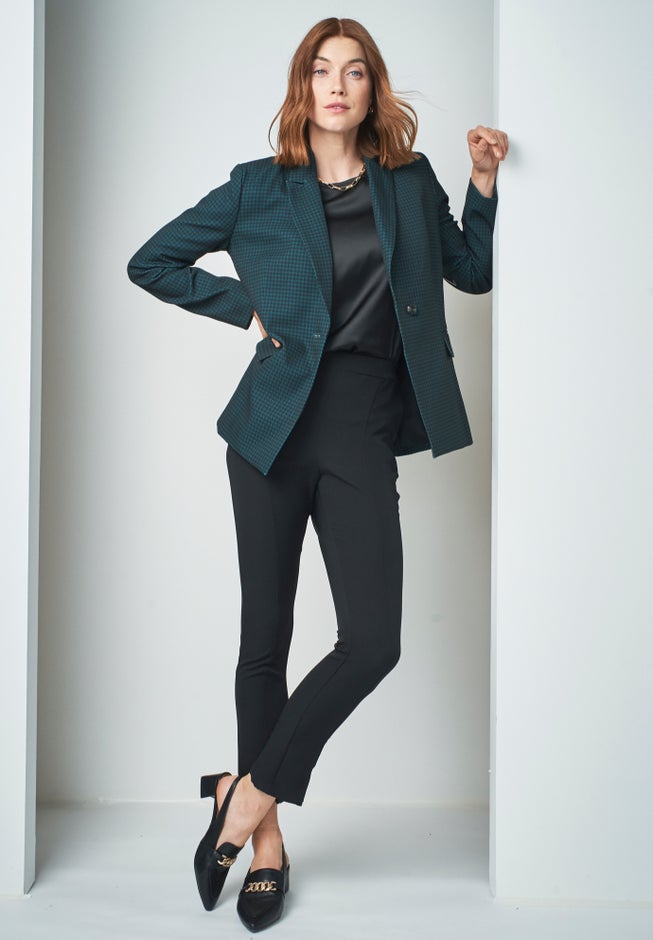 Revive your office style with a new blazer that’s equally chic and professional. This blazer features an intentionally off-center asymmetrical button closure to create a flattering sinched waist silhouette. For a polished look, pair it with our Bi-Stretch Wide Leg Pant.