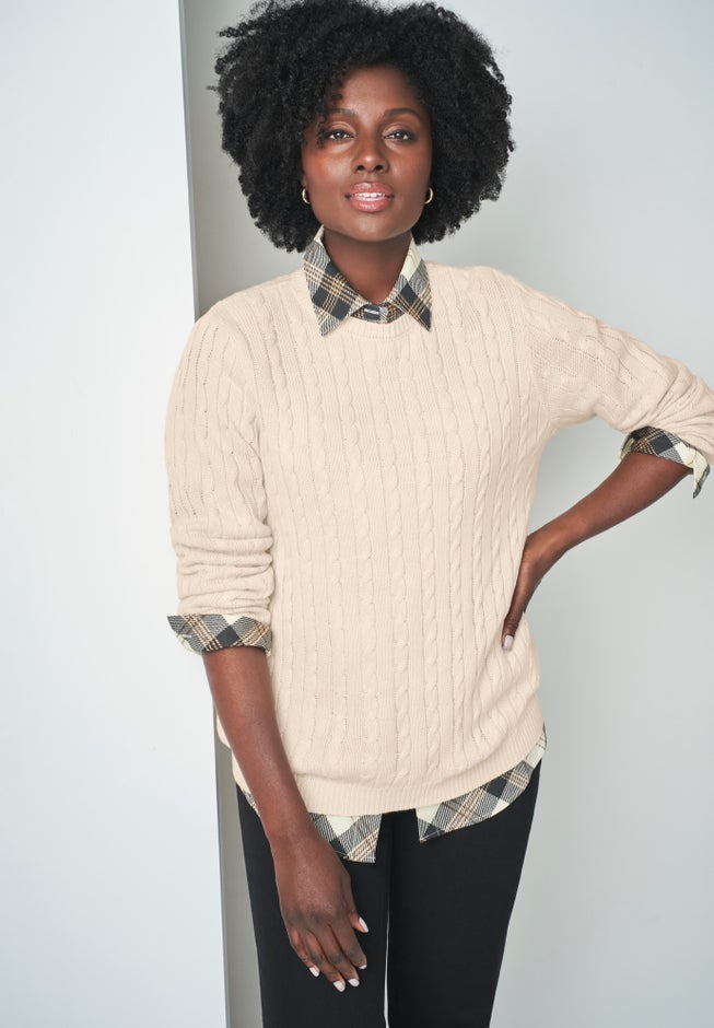 The Jessica London women's plus size Cable Knit Crewneck Sweater is a cozy, must-have layer to take into chilly temps. Features a crew neckline and a relaxed fit that makes it easy to layer with our Stretch Cotton Poplin Shirt.
