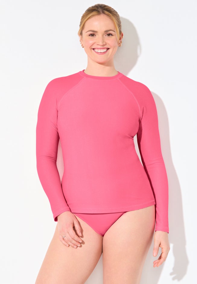 Streamlined and sun-smart, this quick-dry rash guard offers lightweight coverage with a modern, slim fit. With a sleek mock neck and protective long sleeves, this stylish swim topper is crafted from chlorine-resistant and sun-protective fabric. Designed to keep its shape, color, and comfort through every swim or seaside stroll.