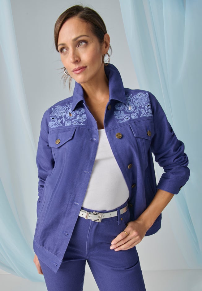 The Jessica London women's plus size Classic Cotton Collection Denim Jacket is an essential layer for everyday, complete with a classic shirt collar for everyday polish. Features a relaxed fit, classic seaming details and practical pockets.