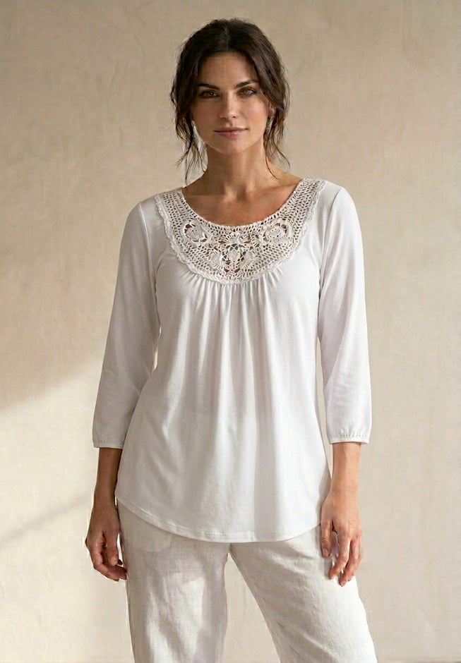 Feminine crochet accents takes this tunic to the next level. Pair it with your favorite skinny jeans.
