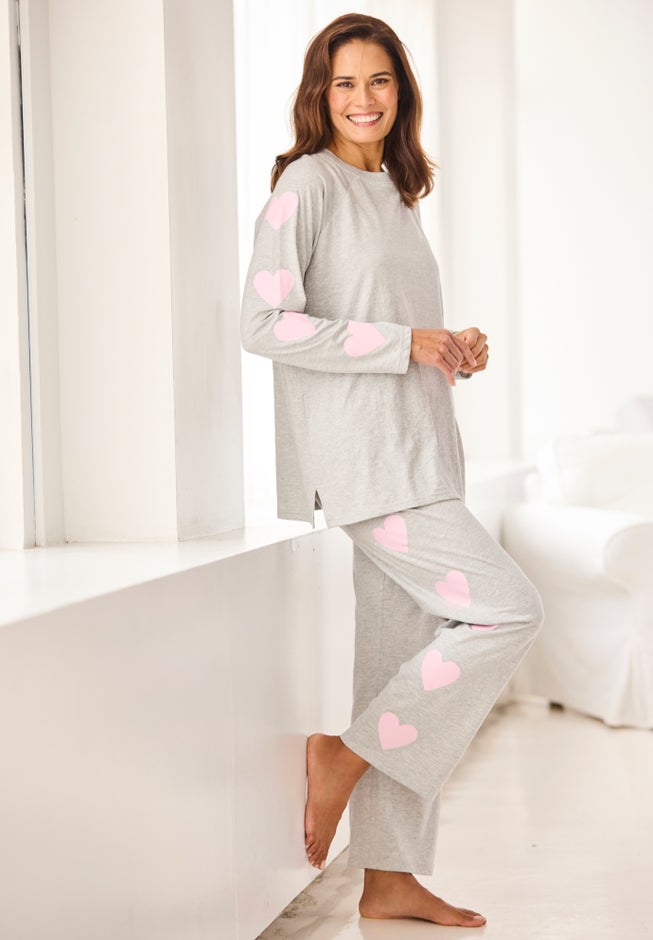 Sleep comfortably in this Side Print Pajama set. Relaxed scoop neckline with rib trim. Feminine raglan full-sleeves and side slits at hem. Bottoms have an elastic pull-on waist. Straight-leg with double top stitch.