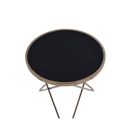 Update your living room with a functional art piece. The Valora end table uses a mid-century inspired base finished in champagne and supports a framed black glass top. The finish and black glass make for a sophisticated look.