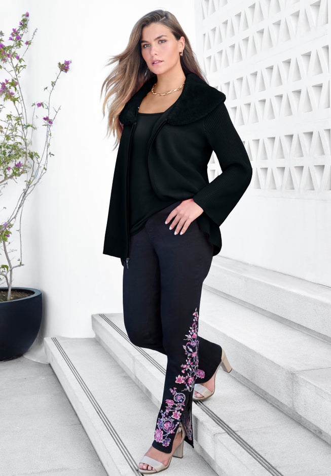Item Number: 1082430Look your glamorous best with this faux-fur collar cardigan. Unique details like flattering bell sleeves, a removable collar, rib trim, and a full zip front keep you warm, cozy, and stylish. Wear it with a notch-neck or v-neck top with some high-waisted pants.