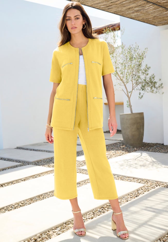 Raise the standard for a casual-chic outfit with this cropped set. This zip-front top and wide-leg pants are knit from ultra-soft Baby French Terry to give you the ultimate comfort—whether you're lounging or stepping out. The pants feature a pull-on, elasticized waistband and side seam pockets. Elbow-length sleeves. Faux top pockets and functional bottom pockets with zippers.