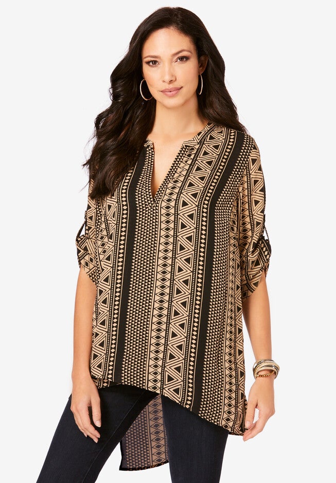 The modern geometric print takes this flowy tunic from simple to stunning with a split neckline and an asymmetrical crossover bottom hem. Three-quarter roll-tab sleeves, a-line silhouette.