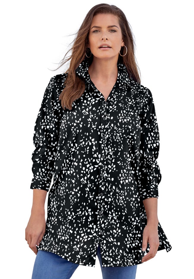 The Kate Tunic is relaxed and lightly tailored with a button front, collar and side slits. This long-sleeve style features a substantial, crisp cotton-blend woven fabric that is designed to hold its shape and maintain a neat, tailored appearance. Its structured feel is what prevents wrinkles from appearing while wearing, giving you polish that lasts all day.
