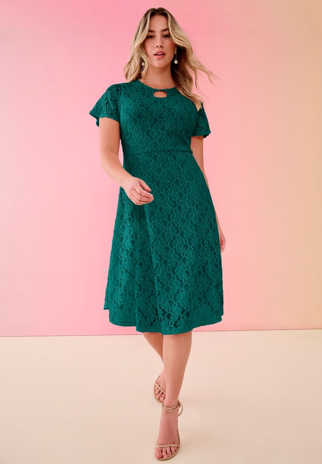 Look great from every angle in this charming allover lace dress featuring a so-pretty scalloped keyhole at the neckline. Flutter sleeves. Fully lined body. Side zip.