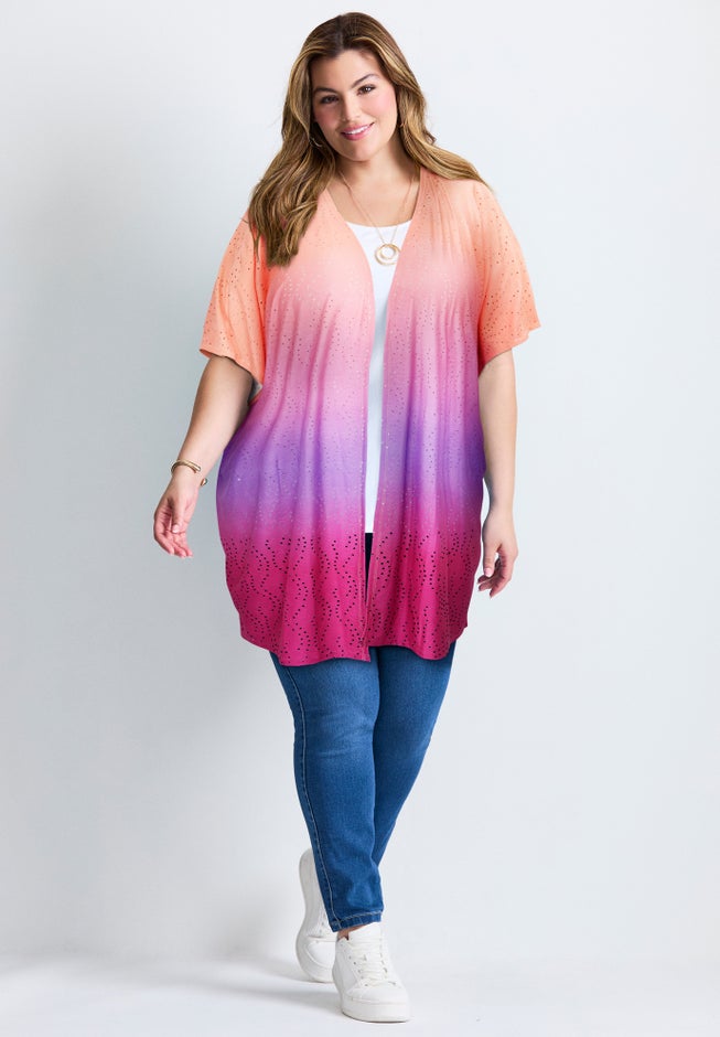 Effortlessly stylish and lightweight, this open-front cardigan is the perfect layering piece. Featuring a relaxed fit, airy short sleeves, and a delicate eyelet cutout design, it drapes beautifully over any outfit.