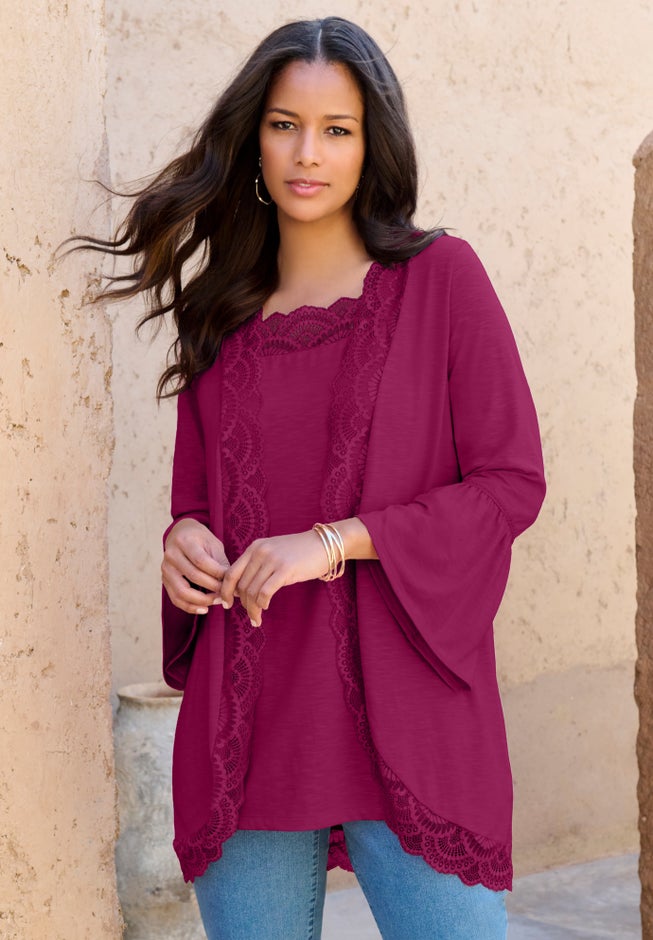 Item Number: 1086503Double up on intricate and rich lace detail with this set. Lace trim lines both the open front and rounded hem of the cardigan and the square neck of the tank, offering alluring charm to your look. Bracelet-length bell sleeves on the outside layer add a final flourish. Banded straps and relaxed silhouette on the tank. It's incredibly versatile—wear the set together, style the tank alone or layer the cardigan over a sleeveless dress.