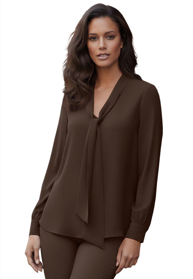 Item Number: 1010542A comfortable, modest fit from desk to dinner, this top is a gorgeous style that's ready for all occasions. It's adorned with an elegant bow in front of the deep V-neckline. Long sleeves with double button cuffs. Center back shirring. Shirttail hem.