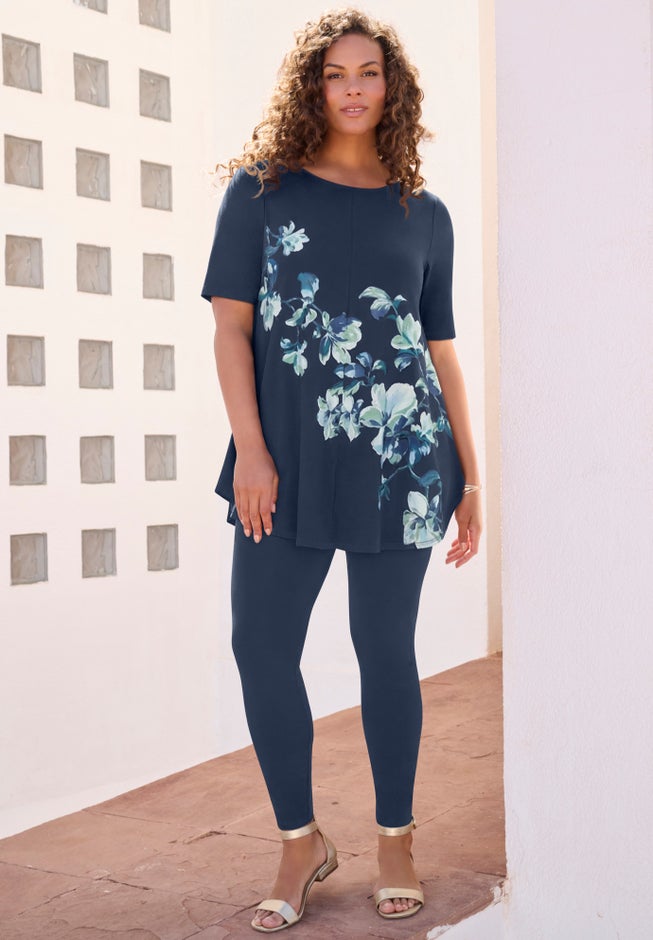 Item Number: 1051581A well-rounded feminine look starts here. The soft tunic features placement-print detail at the boat neckline with a figure-loving fit-and-flare silhouette and center seams. Elasticized pull-on legging with placement print detail at hem.
