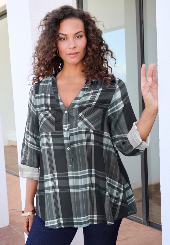 Item Number: 1106487This Henley tunic features a classic plaid pattern, which is both sophisticated and casual enough for daily wear. Two front patch pockets and roll-tab sleeves make this an easy layer between seasons. Shirttail hem.