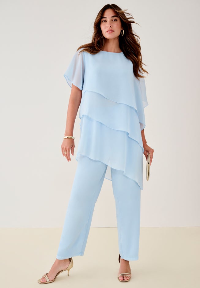 Item Number: 1078335Made of lightweight georgette, this ensemble embodies effortless elegance. Tiered short-sleeve overlay, asymmetric tunic tank with capelet short sleeves, straight-leg elasticized pants.
