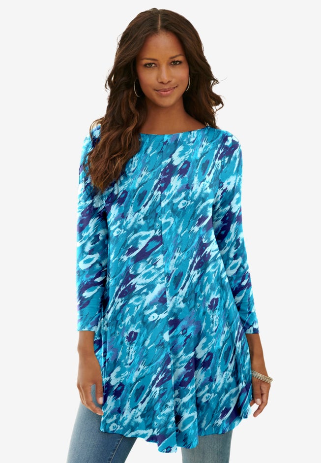 Item Number: 1032600A flowy and feminine tunic crafted in extra-drapey, soft stretch fabric. The swing silhouette offers easy elegance, flowing just the way you love over your curves and wears so well with any of your favorite bottoms. It dresses up or down easily. With bracelet-length sleeves and a shaped hem.