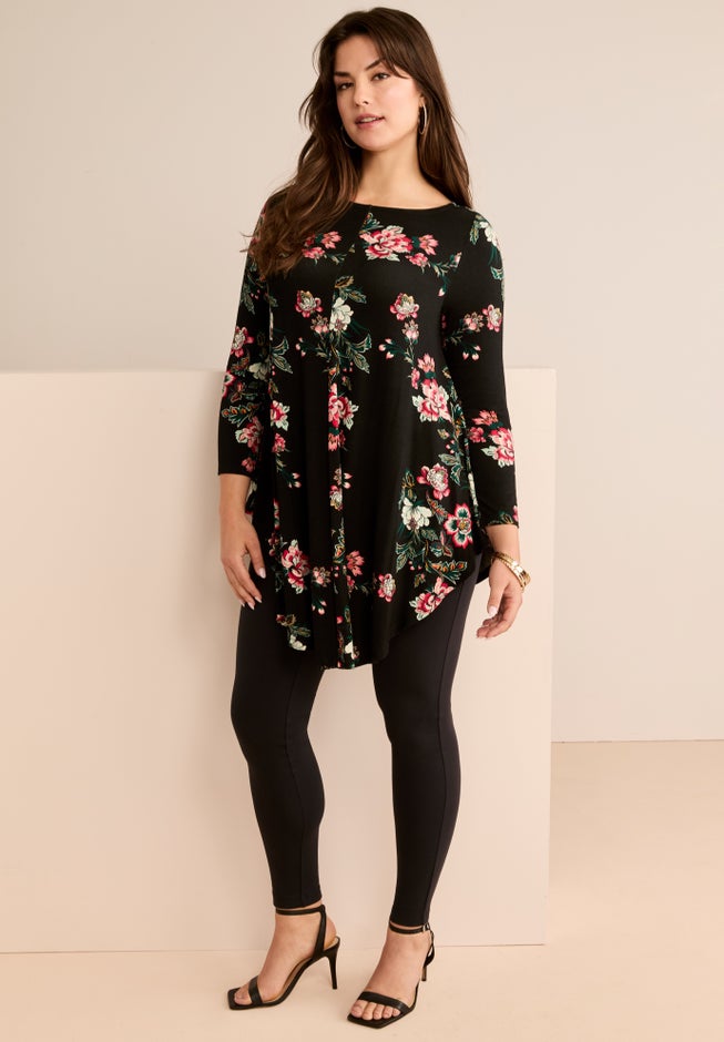 Item Number: 1032600A flowy and feminine tunic crafted in extra-drapey, soft stretch fabric. The swing silhouette offers easy elegance, flowing just the way you love over your curves and wears so well with any of your favorite bottoms. It dresses up or down easily. With bracelet-length sleeves and a shaped hem.