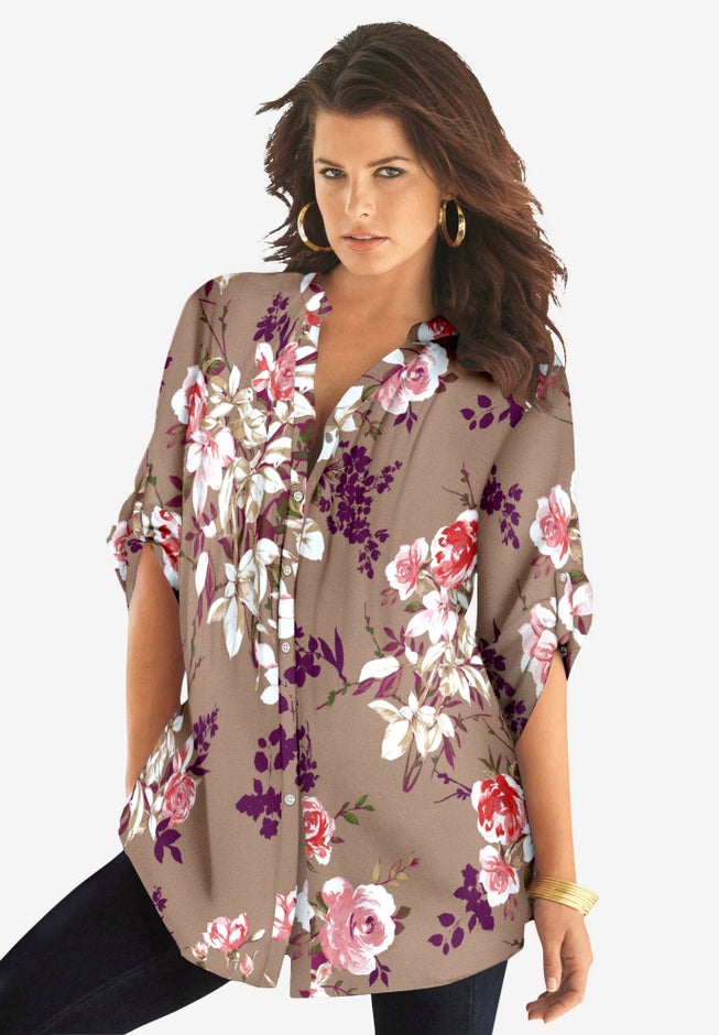 Item Number: 1036646A pretty shirt for stepping up your everyday look. With a feminine Y-neck and long sleeves that can adjust to three-quarter with the button tabs. Shirttail hem. Neat pintucks along the front offer extra room for a generous fit.