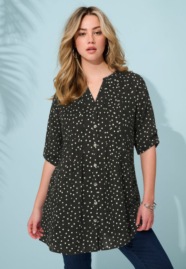 Item Number: 1036646A pretty shirt for stepping up your everyday look. With a feminine Y-neck and long sleeves that can adjust to three-quarter with the button tabs. Shirttail hem. Neat pintucks along the front offer extra room for a generous fit.