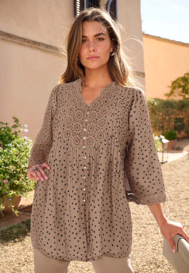 Hit all of the major style trends with this delicate style featuring an intricate lace-bib front, lace-detailed three-quarter sleeves, a pleated front and back, and an elbow sleeve feminine, flowy & flattering.