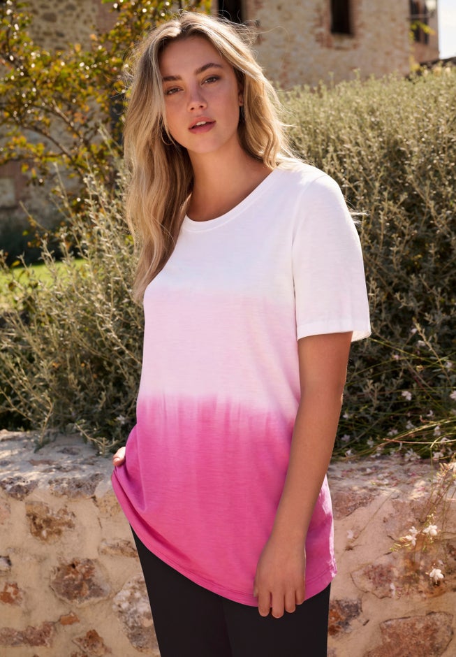 With its scoop neckline and short sleeves, this Ombre Tee effortlessly transitions between casual days and social get-togethers—proving that simple can still be stunning. Featuring a soft ombre effect, side ruching for a flattering shape, and a relaxed fit, this tee adds a touch of color and comfort to your look.