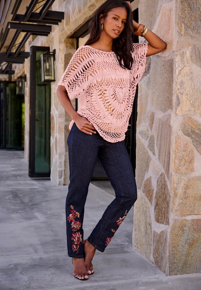 Item Number: 1005677The open hand crochet stitch work and flattering fit will have you reaching for this sweater again and again. Pullover style, short batwing sleeves, rounded hem.