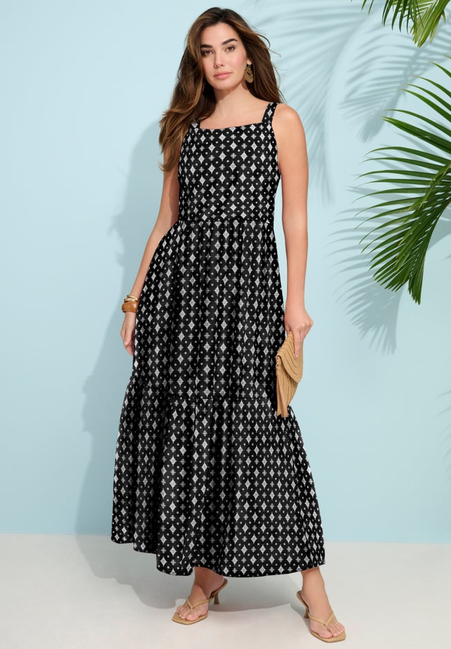 Item Number: 1115002A modern square neckline and adjustable straps define this flattering A-line maxi dress, complete with a shirred elastic waistband, lined bodice, and hidden back zipper for a flawless fit. Soft gathering adds texture without bulk, and pockets elevate the everyday wearability. Wear it with heeled sandals and a statement necklace for evenings out, or keep it simple with slides and a tote.