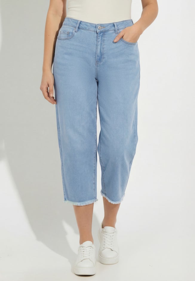 Item Number: 1115080A straight-leg silhouette and frayed hem give these cropped capri jeans an effortless flair. The raw-edge finish adds personality and texture, while five-pocket styling and a zip fly keep the look timeless. Wear these capris with a breezy tunic, or dress them up with a statement top.