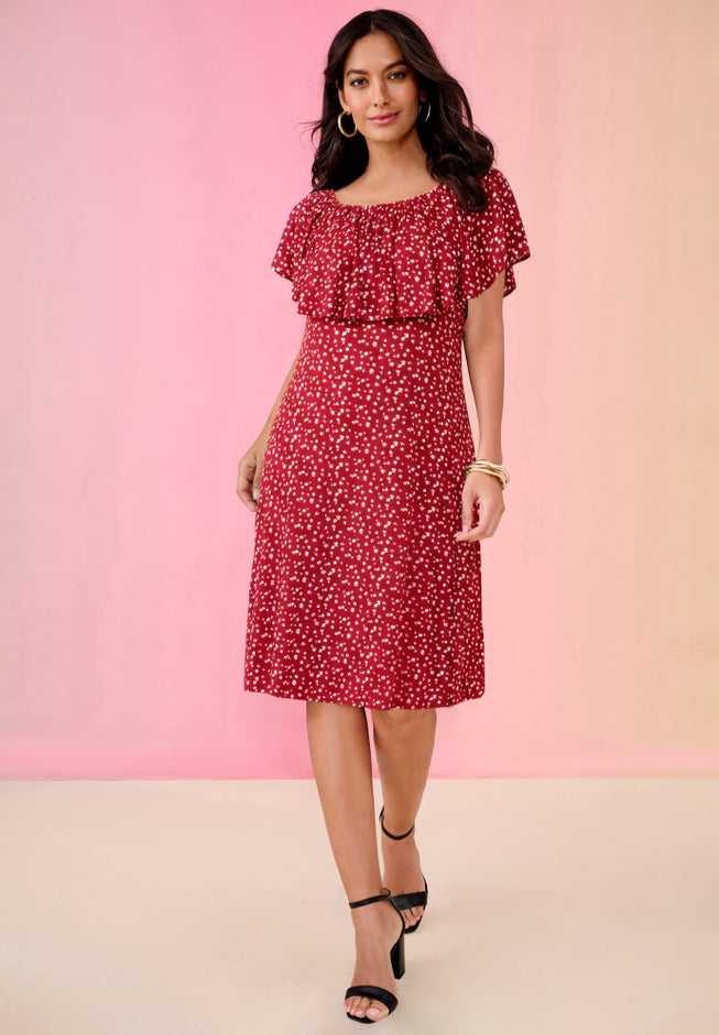 Item Number: 1114798This off-the-shoulder flounce dress is all about easy elegance, featuring a convertible neckline that lets you instantly switch from classic to flirty. The flowy A-line silhouette flatters your curves, while the flounce detail and hidden on-seam pockets bring both charm and function. Just add hoop earrings and espadrilles for a weekend-ready look that turns heads with zero effort.