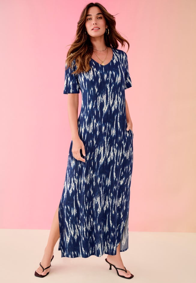 Item Number: 1114964This maxi dress blends elevated style with everyday comfort, featuring a flattering V-neck and a side slit that's both appealing and for easy movement. Designed with on-seam pockets, short sleeves and a straight hem, this dress offers functionality without sacrificing sophistication. Perfect for dressing up with heels or keeping it casual with slip-on flats, it's your go-to piece for versatile, confident looks.