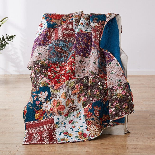 Capture the beauty of the season with classic colors and rich, updated florals. Digitally printed onto whole cloth in a patchwork appearance, with an imaginative awareness of time honored quilting traditions, the Poetry quilted throw blanket reverses to an all over solid color peacock blue. Machine quilted with fabric bound edges for durability and surface interest. Dimensions: 50x60 inches (+/- 2”). 100% microfiber shell, 100% polyester fill. Machine Wash. Imported. Throw measures 50x60 inches (+/- 2 inches). The perfect quilt for your sofa or loveseat - also makes a spectacular wall hanging!. Reverses to a coordinate solid color for two looks in one!. Machine washable. EASY CARE 100% microfiber polyester face; 100% polyester fill. Imported.