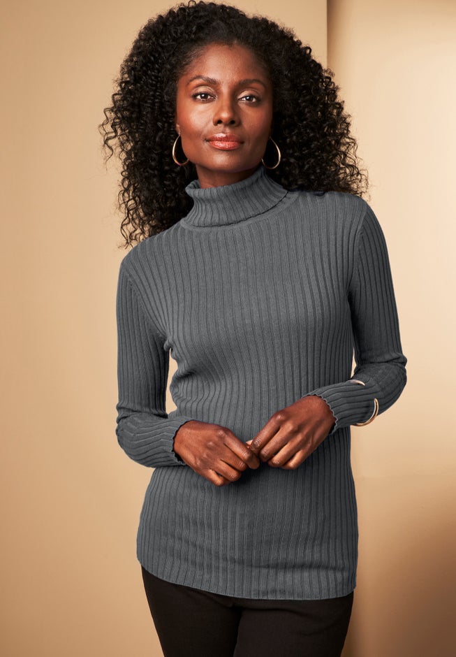 A timeless wardrobe essential for spanning the season, the Jessica London plus size women's Ribbed Cotton Turtleneck Sweater is crafted in a feel-good ribbed knit with a flattering refined fit.