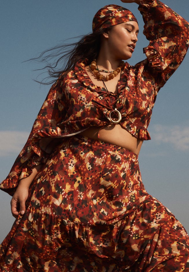 A statement piece for the season, this cropped top channels playful femininity with its romantic ruffles and tie-front design. Flowy flare sleeves and soft structure give it that breezy, fashion-forward feel—perfect for pairing with everything from denim to wide-leg trousers for a modern, trend-right look.