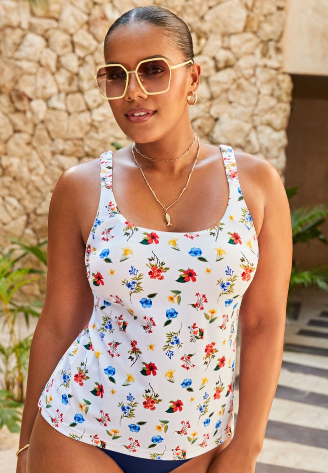 A scoop neck tankini top that combines style with support. This bust-boosting top features an inner floating shelf bra with sewn-in cups set in a Power Mesh frame with a plush elastic underbust band. Side-bust shirring adds soft shaping while ruched fabric straps with rubber hold stay comfortably in place. Adjustable back straps allow you to personalize your fit, making this your new go-to swim style.