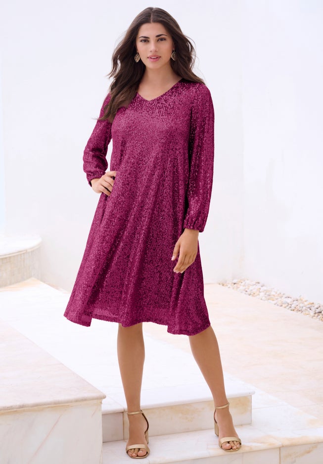 Item Number: 1082399Ready, set, sparkle! Crafted from sequin mesh, this V-neck dress has all the eye-catching appeal with a flowing swing silhouette for plenty of movement. Long blouson sleeves with elasticized cuffs. Lined at the body.