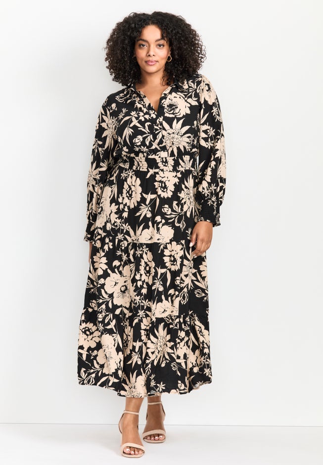 • Collared Button through Bodice Tiered Maxi Dress