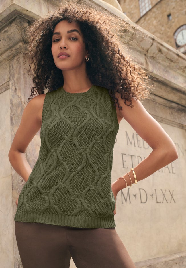 Polished and sophisticated in a classic cable knit, the Jessica London women’s plus size Sleeveless Cable Shell is crafted in a flattering straight silhouette. Pair it with the matching Elbow Sleeve Cable Cardigan for a coordinating look that always delivers.