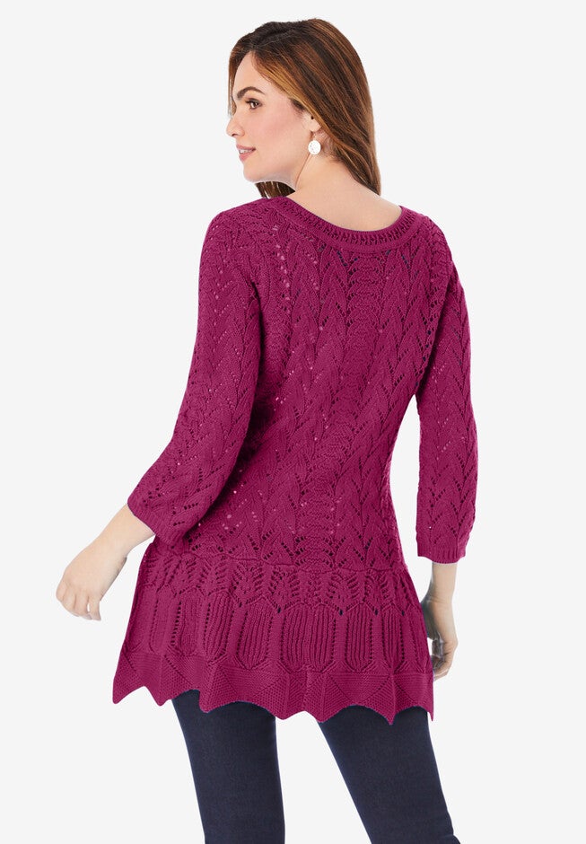 Item Number: 1041194Styled with a scalloped hem, this pretty pullover is detailed with pointelle crochet. U-neck. Three-quarter sleeves.