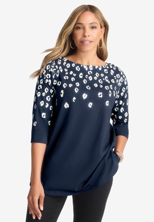 Comfortable stretch cotton maintains its structure throughout the day and skims the body for a polished look without feeling tight. The tunic length stays in place and doesn't ride up, offering plus-size comfort and ease.