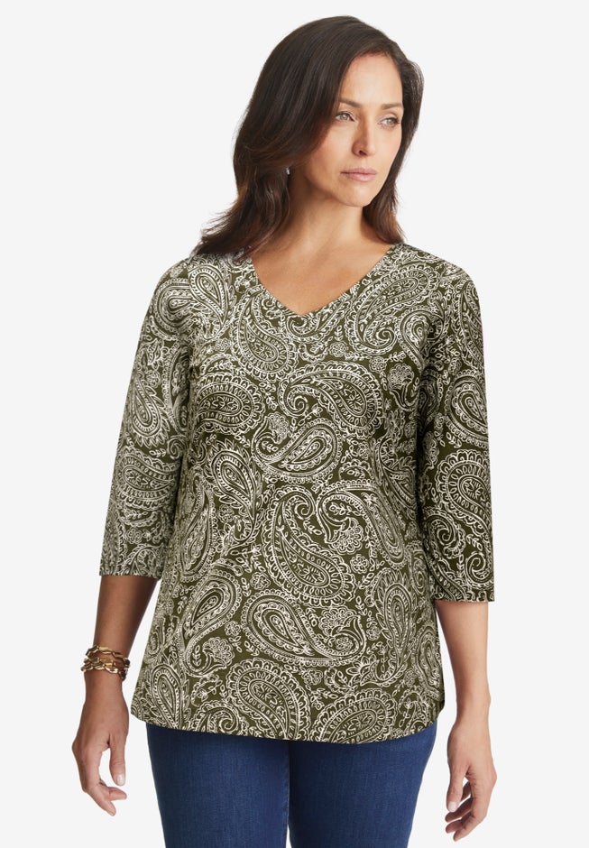 A classic and comfortable staple in every woman's wardrobe, this feminine V-neck tee is better than basic. Striking the perfect balance between fitted and relaxed, complete with three-quarter length sleeves, this everyday essential style is cool enough to wear out, yet cozy enough to lounge in.