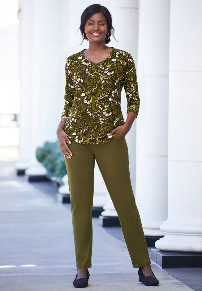 A classic and comfortable staple in every woman's wardrobe, this feminine V-neck tee is better than basic. Striking the perfect balance between fitted and relaxed, complete with three-quarter length sleeves, this everyday essential style is cool enough to wear out, yet cozy enough to lounge in.