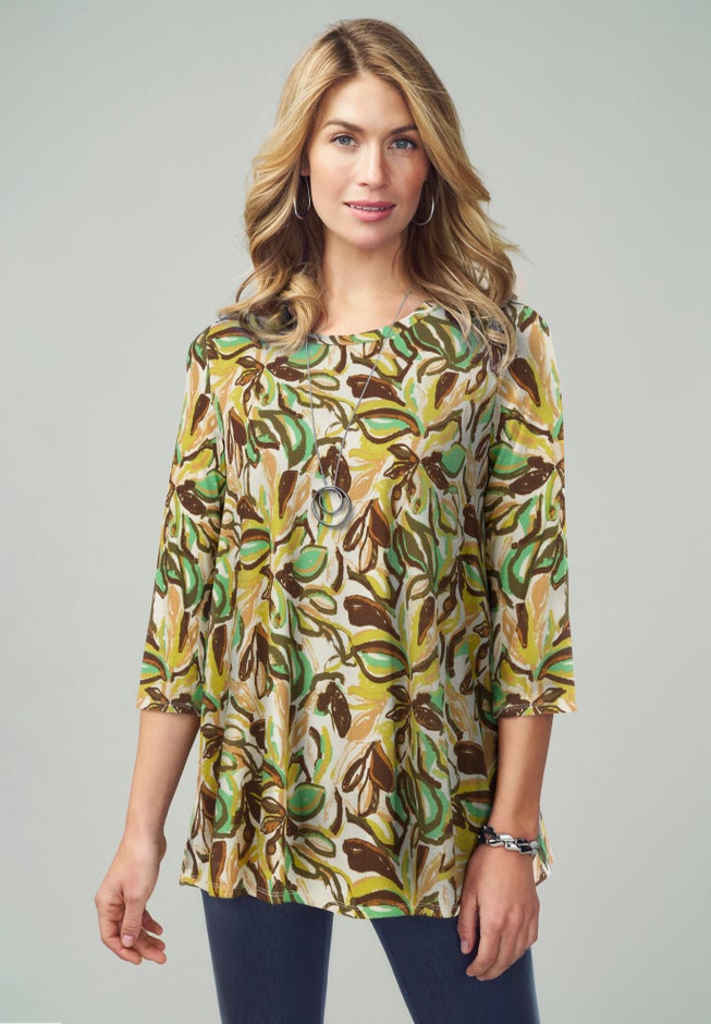 This women’s plus size swing-silhouette tunic flows with a smooth, lightweight drape, thanks to its stretch knit that maintains softness and shape over time. The relaxed fit, three-quarter sleeves, and longer length create an easy, versatile piece that pairs seamlessly with denim, leggings or polished bottoms.