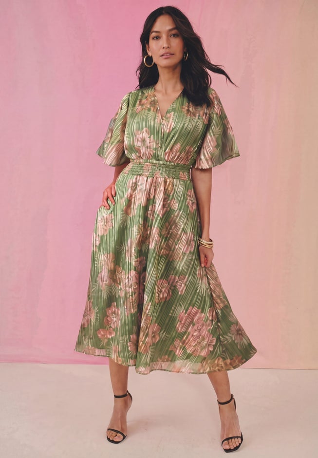 Item Number: 1094835This flutter sleeve V-neck maxi dress features a flattering empire waist and crinkled lurex fabric with subtle variegated stripes. It combines elegance with effortless style, perfect for any formal or casual occasion.