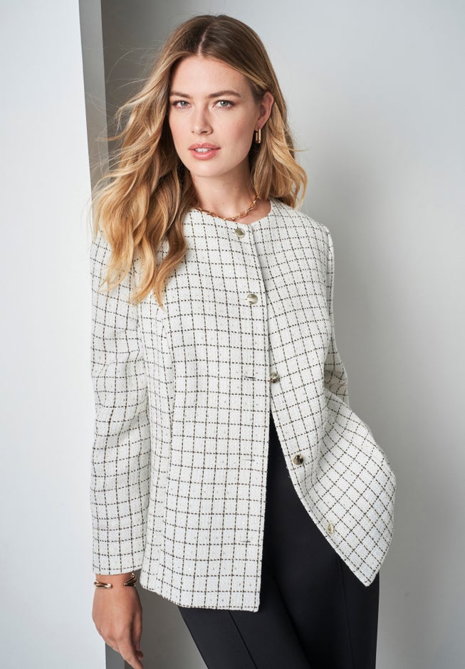 Timelessly stylish in chic tweed, this jacket is a must-have layer that takes you from your workday to a night out. Pair it with slacks and a blouse or jeans and a tee – it's that versatile!