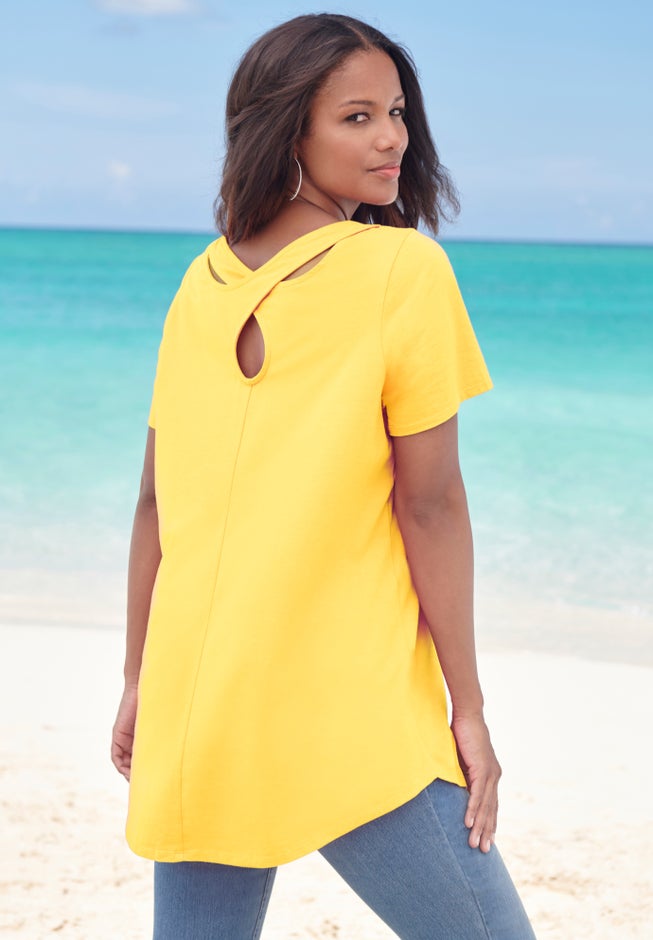 Item Number: 1041023Add an eye-catching upgrade to your tunic collection with this keyhole-back style with pretty crisscross cutouts.