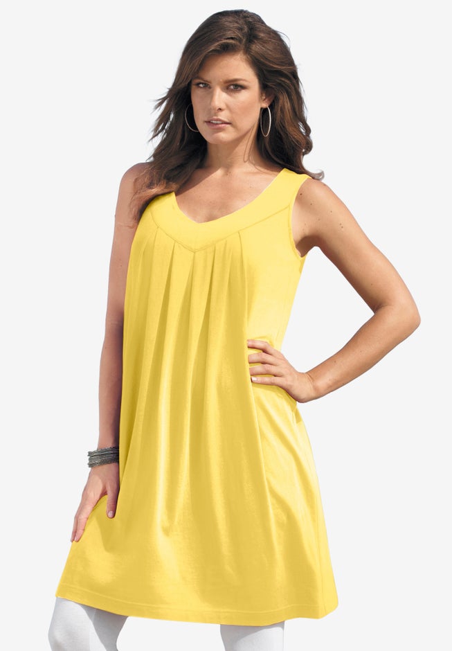 Item Number: 1010497An absolutely stunning tank top to keep in your closet with a pleated front and a V-back design. With its extended length, this tunic tank is just the right mix of style and full coverage.