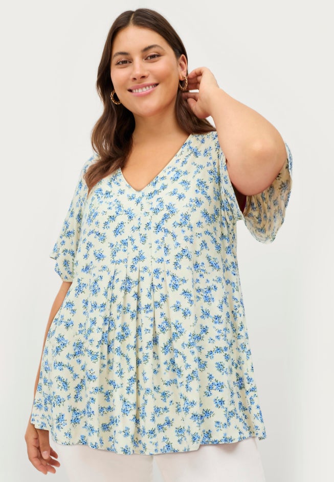 You’re going to love this casual top! This beautifully lightweight and flowy tunic will keep you cool while effortlessly flattering your figure. The flutter sleeves and released pleating at the waist add the perfect feminine touches. Complete the look with jeans and sandals.